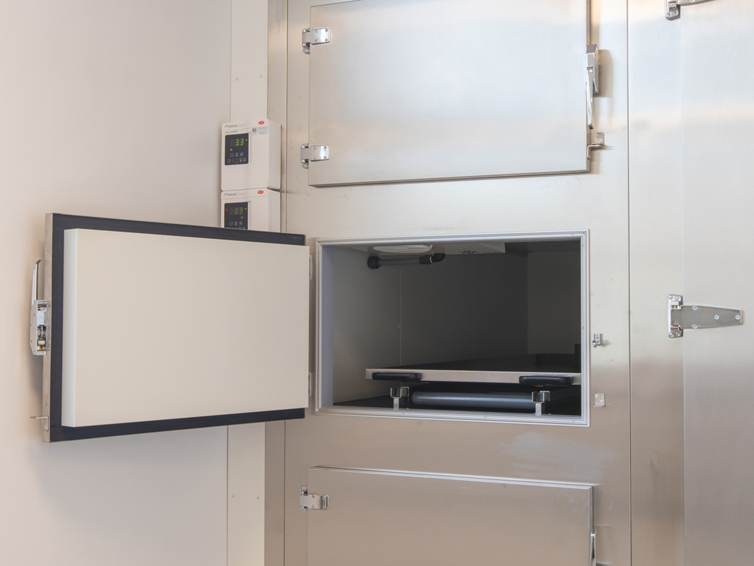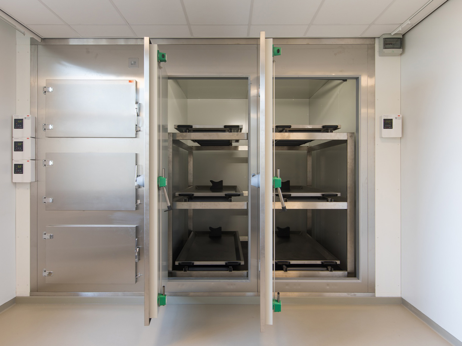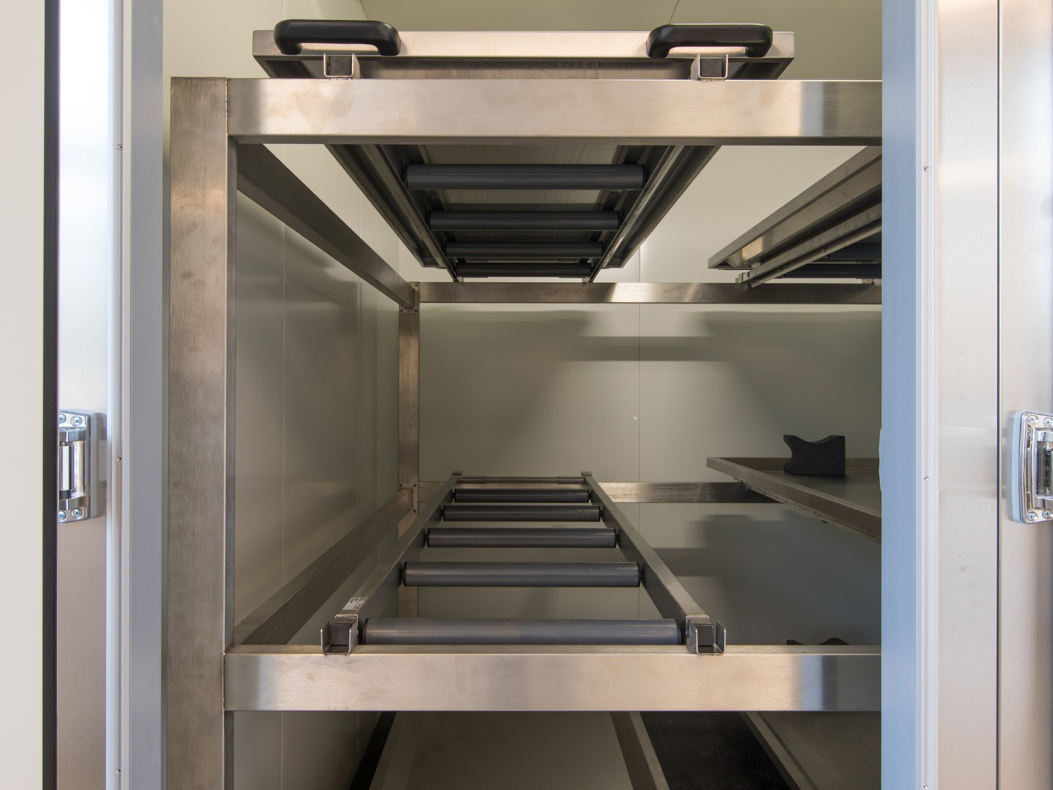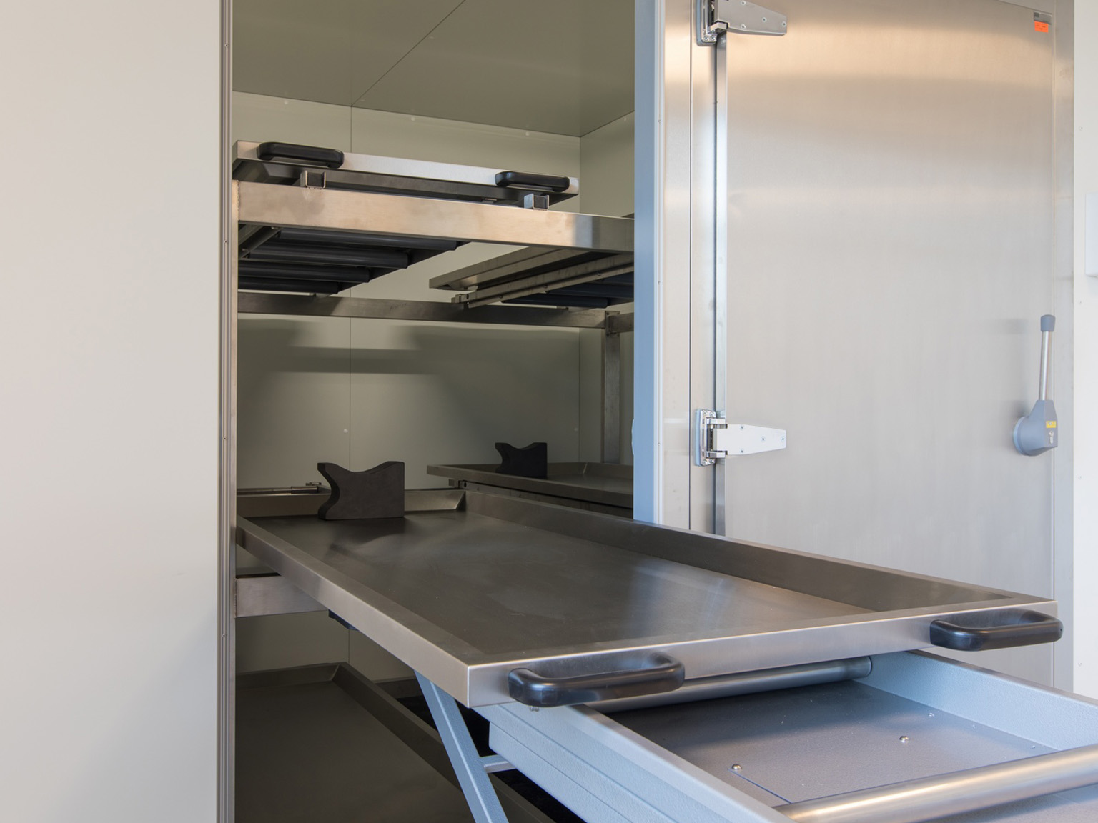Logistical equipment is an important component at a mortuary so that the department's specialists can ergonomically move the remains. This starts with stable racking which is in the cold store. We custom make these suitable for 3, 4 or 5 levels, for example. The roller conveyors to be placed in the racks are equipped with 5 transport rollers and are splash and dust resistant.