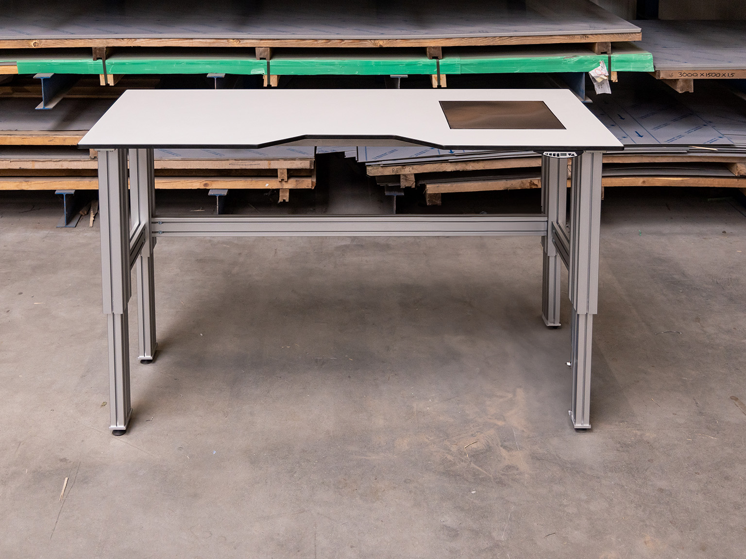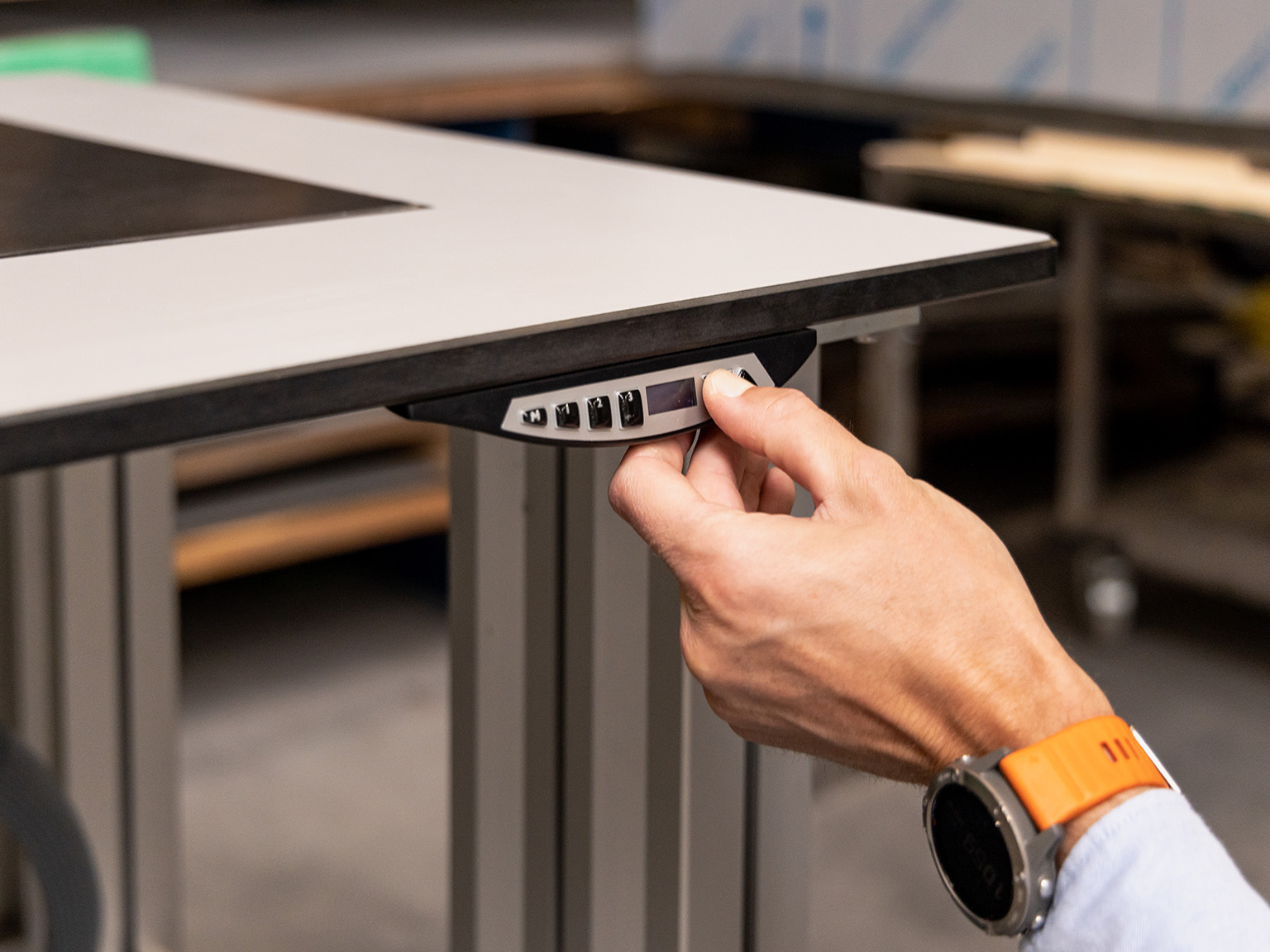 The high-low adjustment has a stroke of as much as 400mm. The base is made of aluminum and has a load capacity of 400 pounds, both in the lowest position but also in the highest position. The top can be supplied in different sizes, thicknesses and colors. Optional add-ons include a drawer unit, monitor support, cable tray, data and wall outlets, lighting and a removable shelf for additional workspace. Here also add the trapezoidal logo from the folder.