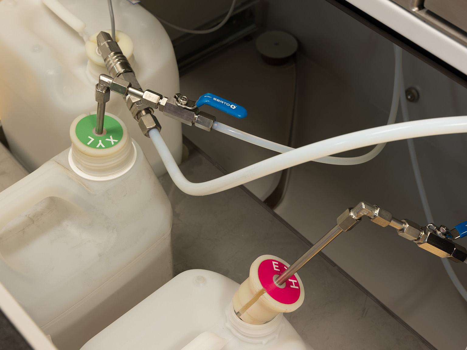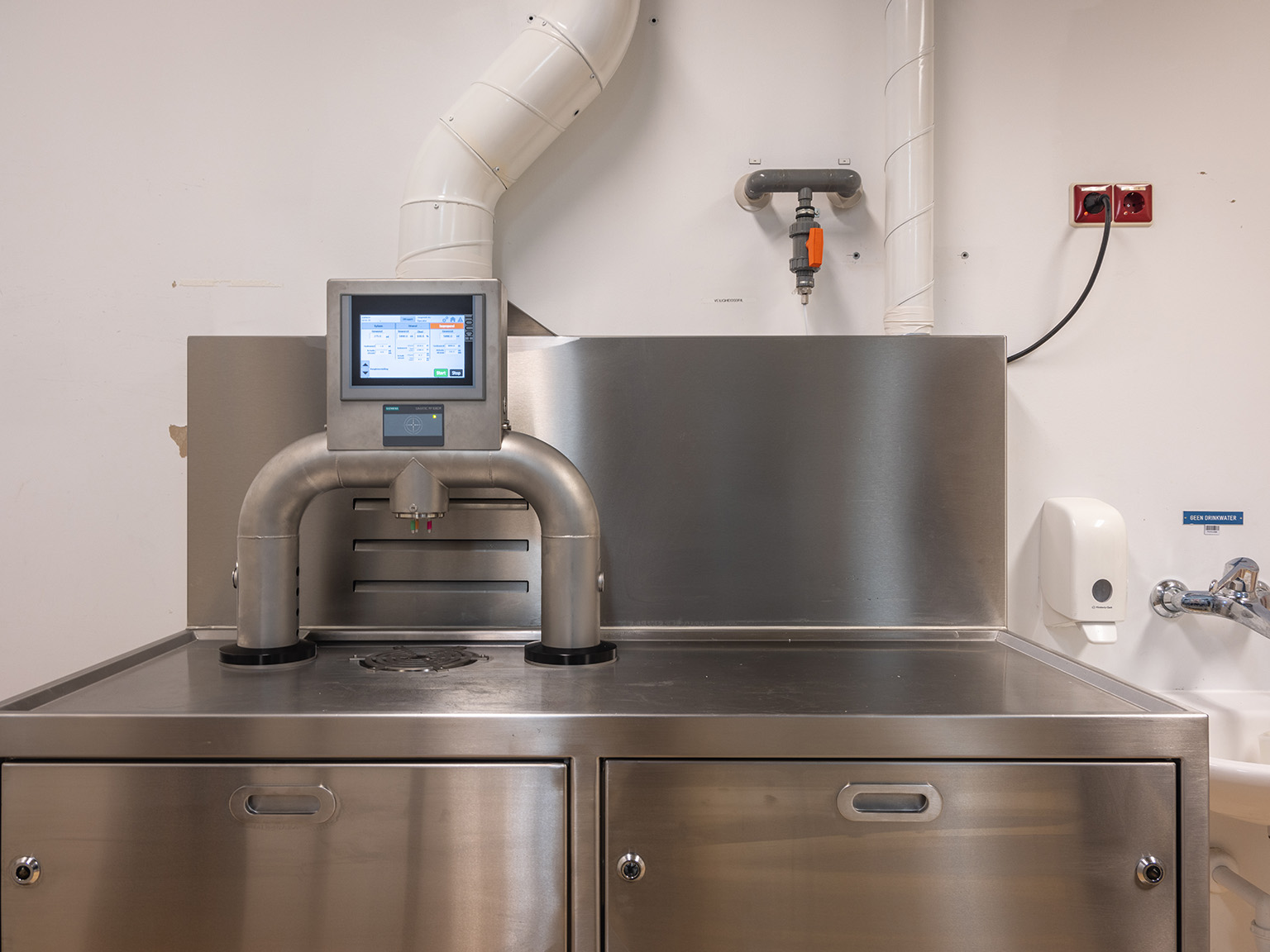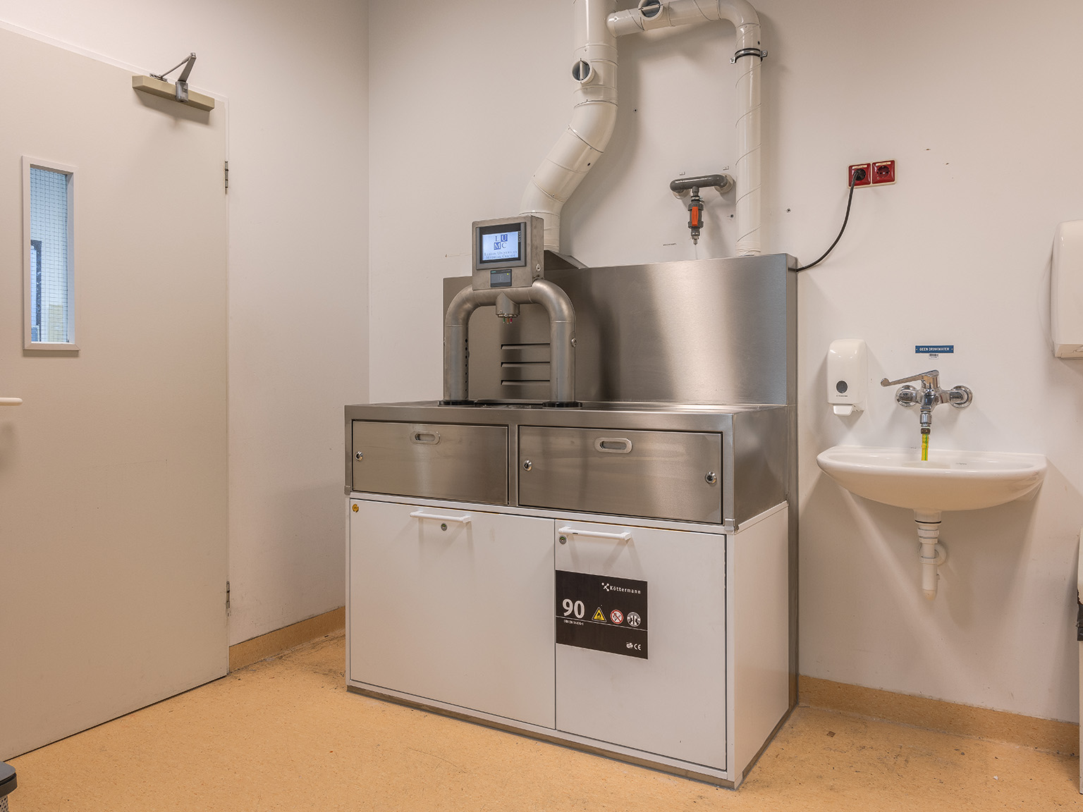 At the rear, released vapors are extracted which can be absorbed by connecting the unit to the hospital’s exhaust system or through a recirculating exhaust system. In this setup three different solvents can be tapped, Xylene, Isopropanol and Ethanol where the latter is mixed with demi water. The slide-out technology rooms are easily accessible for service and maintenance. Applied color coding of the suction lance minimizes human error.