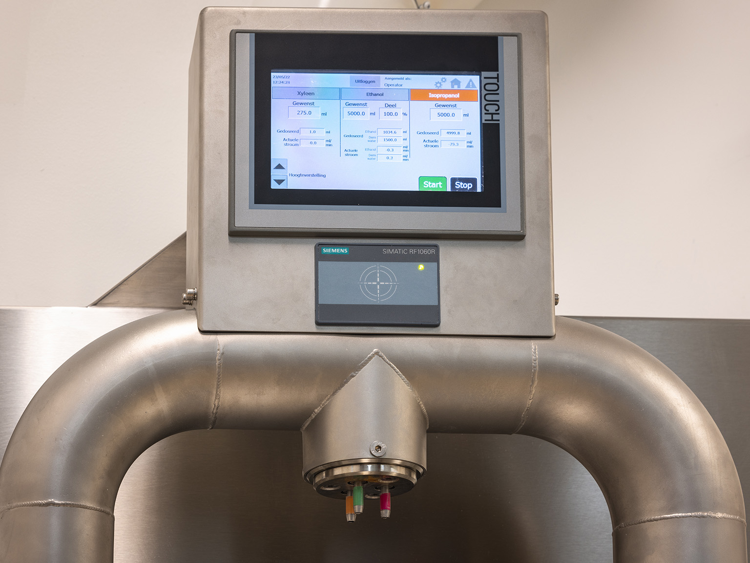 Our innovative tap station is equipped with a safety cabinet in which various solvents can be placed, as well as the waste drums in which the used chemicals are poured. The tap column is adjustable high low and through your staff pass you can operate the user-friendly interface.