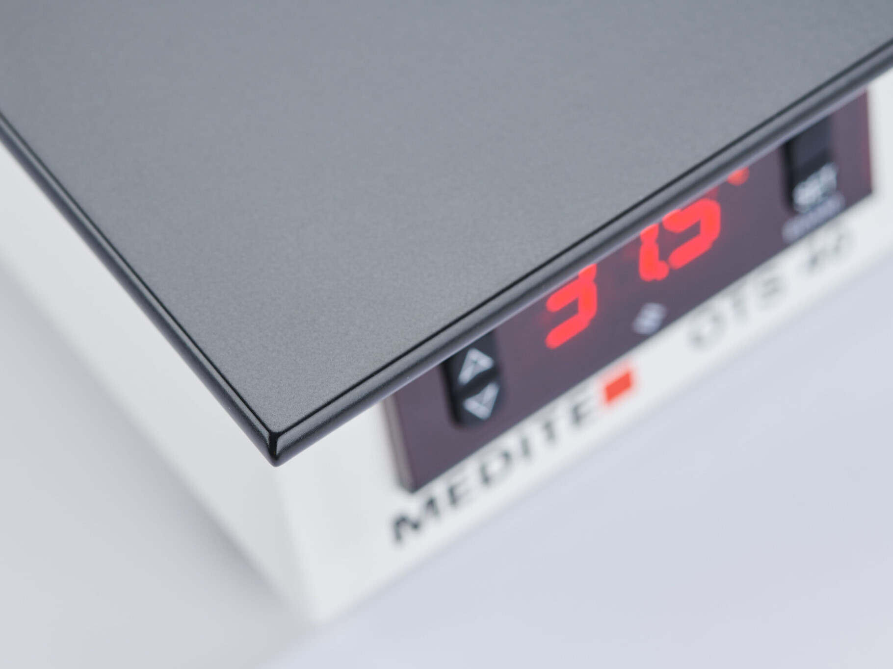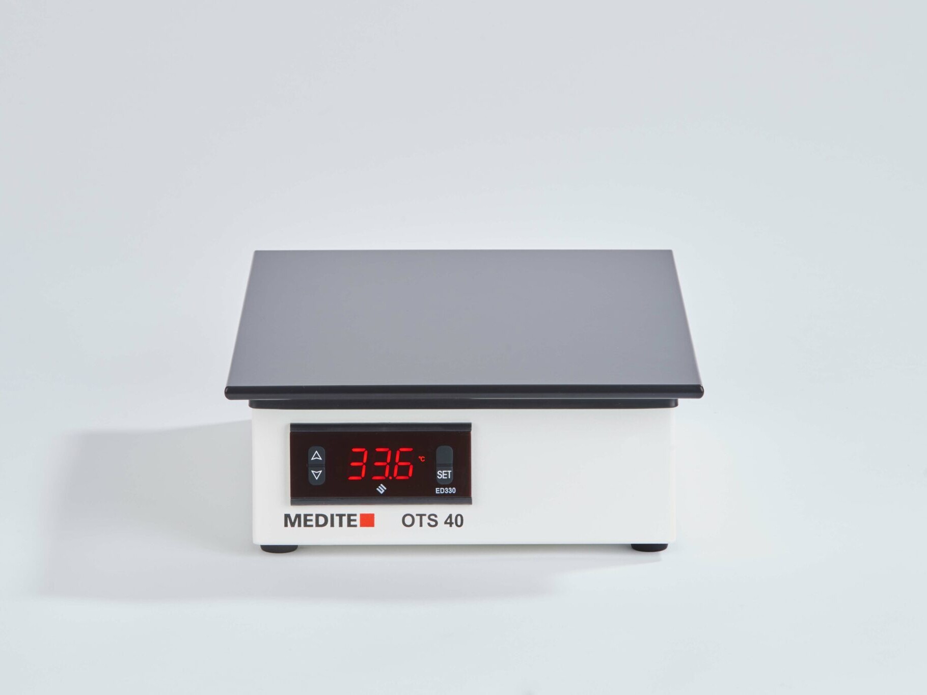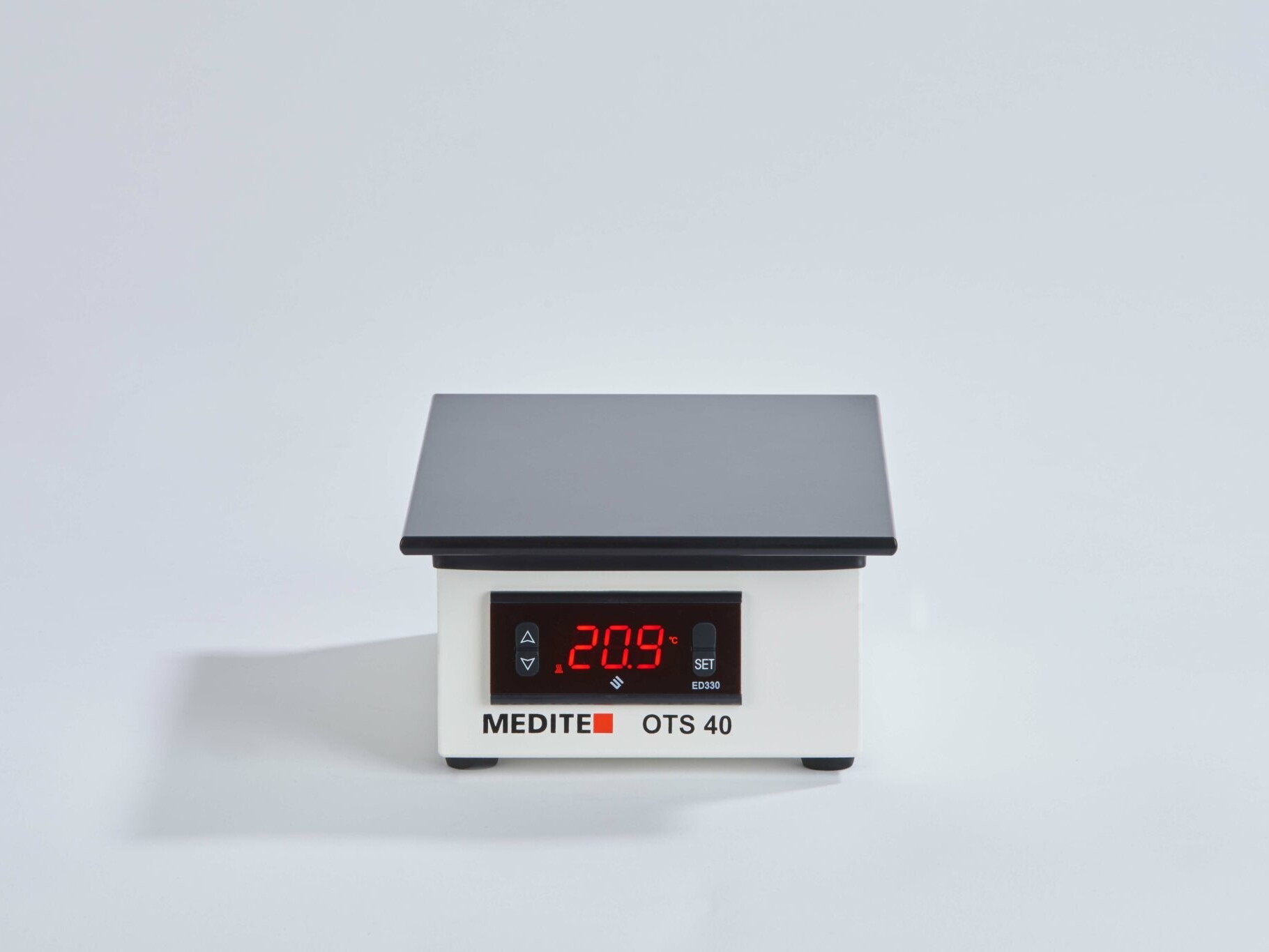Het werkoppervlak bestaat uit een met kunststof beklede aluminiumplaat van 6 mm dik. Dit maakt een snelle opwarming tot de gewenste werktemperatuur mogelijk, die vervolgens gedurende de gehele gebruiksduur stabiel wordt gehouden. Met een digitale temperatuurregelaar aan de voorzijde kunnen temperaturen van max. +99 °C worden ingesteld. Tijdens het gebruik wordt de actuele temperatuur op het display weergegeven. De OTS 40-serie heeft zich met name bewezen dankzij de hoge temperatuurconstantie en de lange levensduur bij routinematig