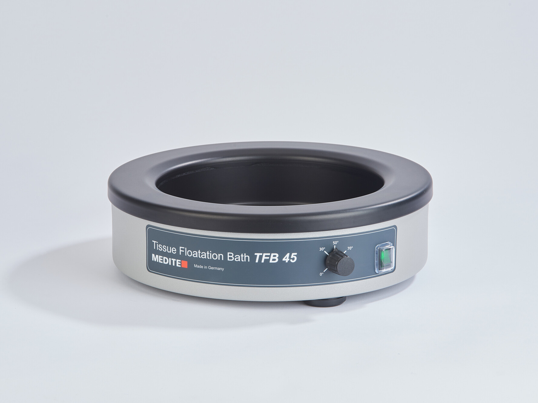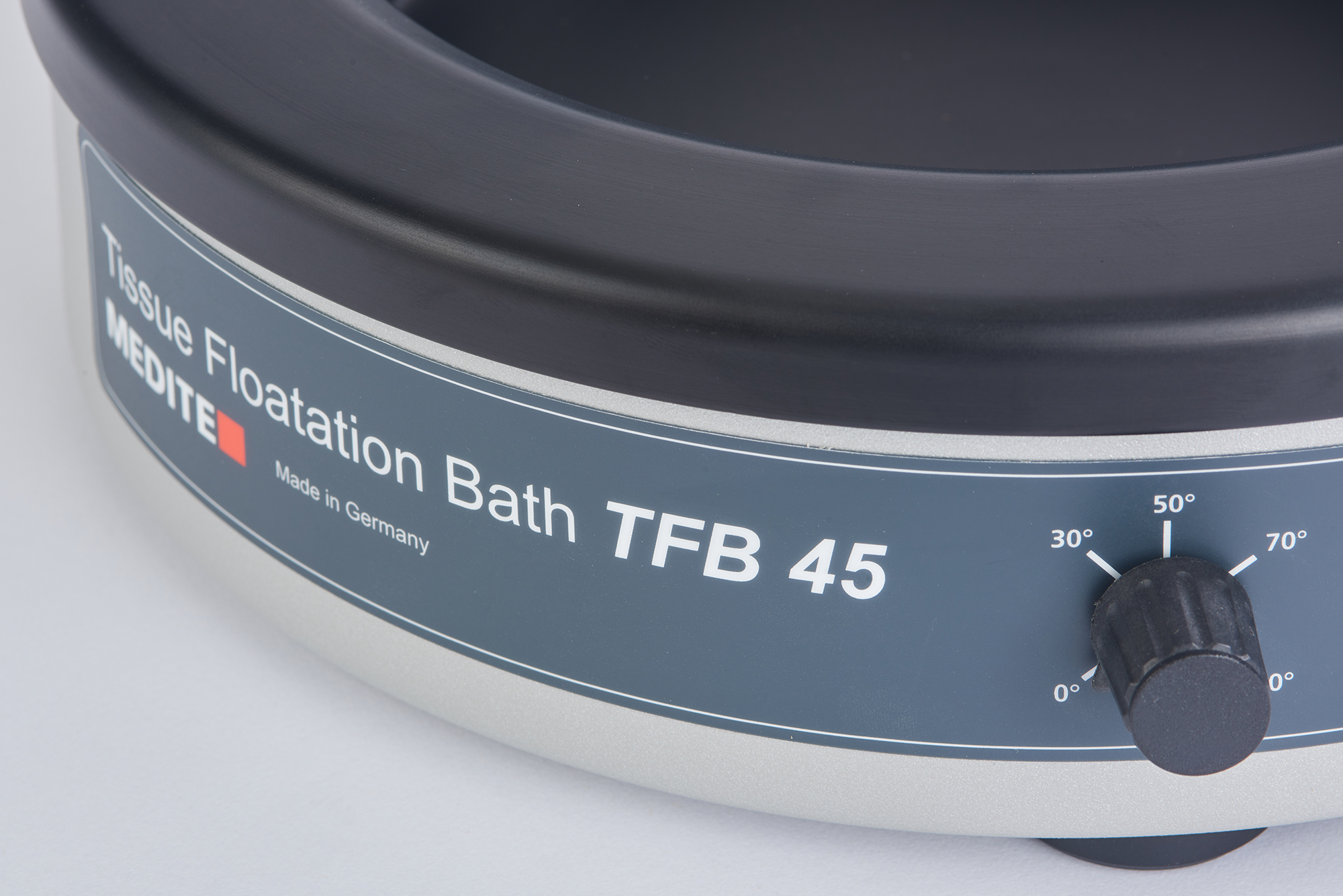 Het ronde Tissue Floatation Bath TFB 45 is een compact en goedkoop apparaat van gepoedercoat aluminium met een inhoud van 1,5 liter. Paraffine secties kunnen worden uitgerekt en op de slide worden getrokken.
