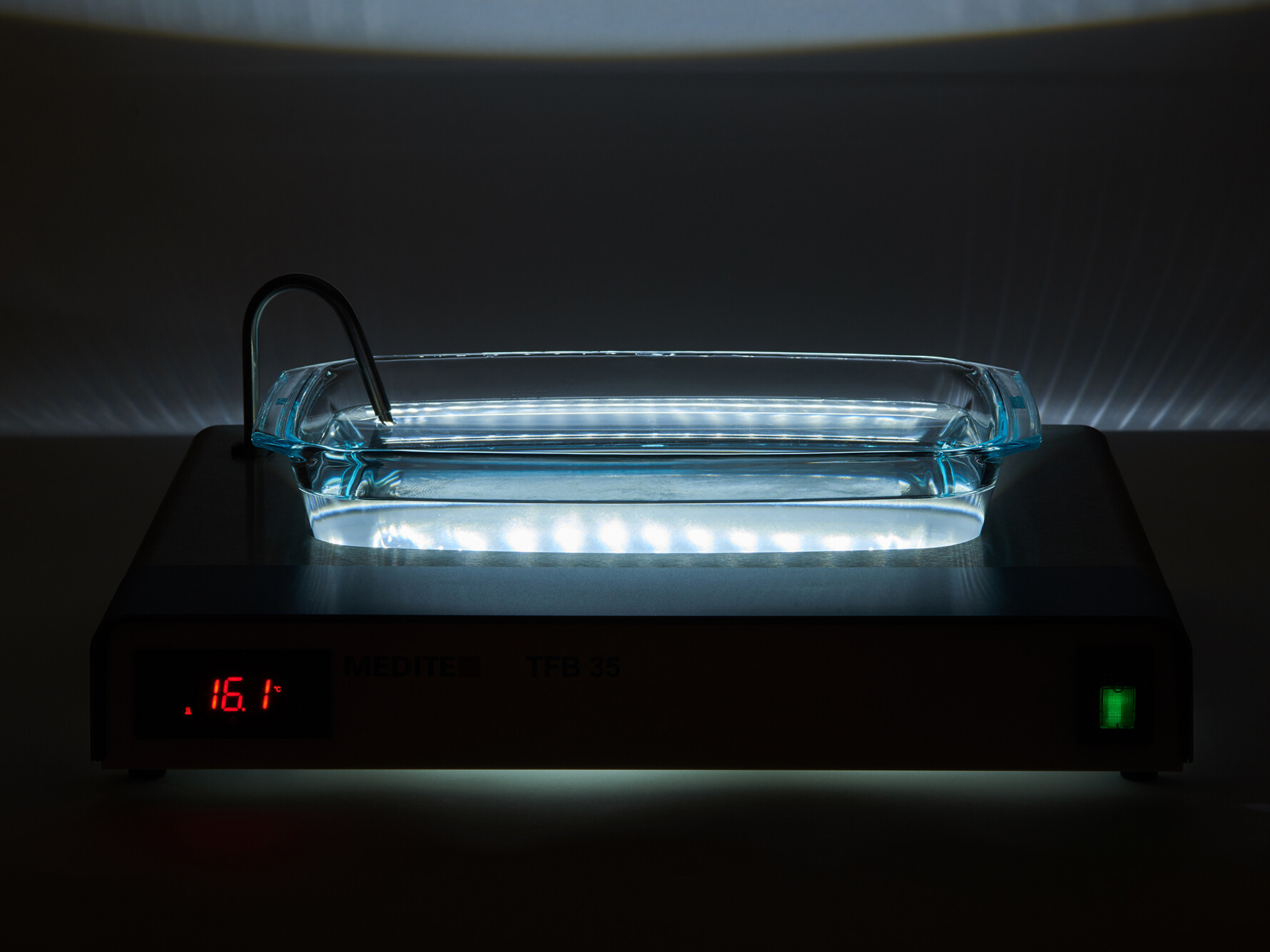 Het Weefselfloatatiebad TFB 35 is een LED-verlicht, rechthoekig rekbad voor paraffinecoupes dat is beproefd en getest in de routine van het dagelijkse laboratoriumwerk. Het centrale onderdeel is de verwijderbare glazen schaal, waaronder zich een LED-lichtstrip bevindt. Het licht komt van de achterste rand onder de glazen schaal, wat zorgt voor een uitstekende zichtbaarheid van de paraffinecoupes op het wateroppervlak.