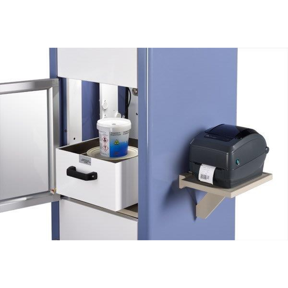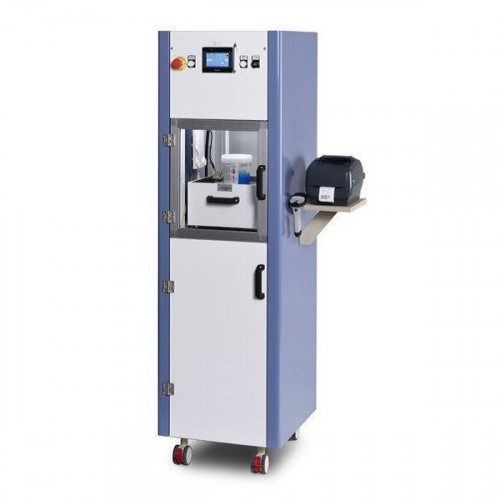 Het grote touchscreen is eenvoudig te bedienen en geeft stap voor stap aan welke waarden ingevoerd dienen te worden. Nadat je geselecteerd hebt welk formaat container je erin plaatst start hij automatisch met vullen en vervolgens kun je de betreffende patiëntgegevens. Deze kun je vervolgens printen op een aantal stickers waarmee je het gat kunt afdekken van het deksel. Een veiligere manier van formaline tappen is er niet!